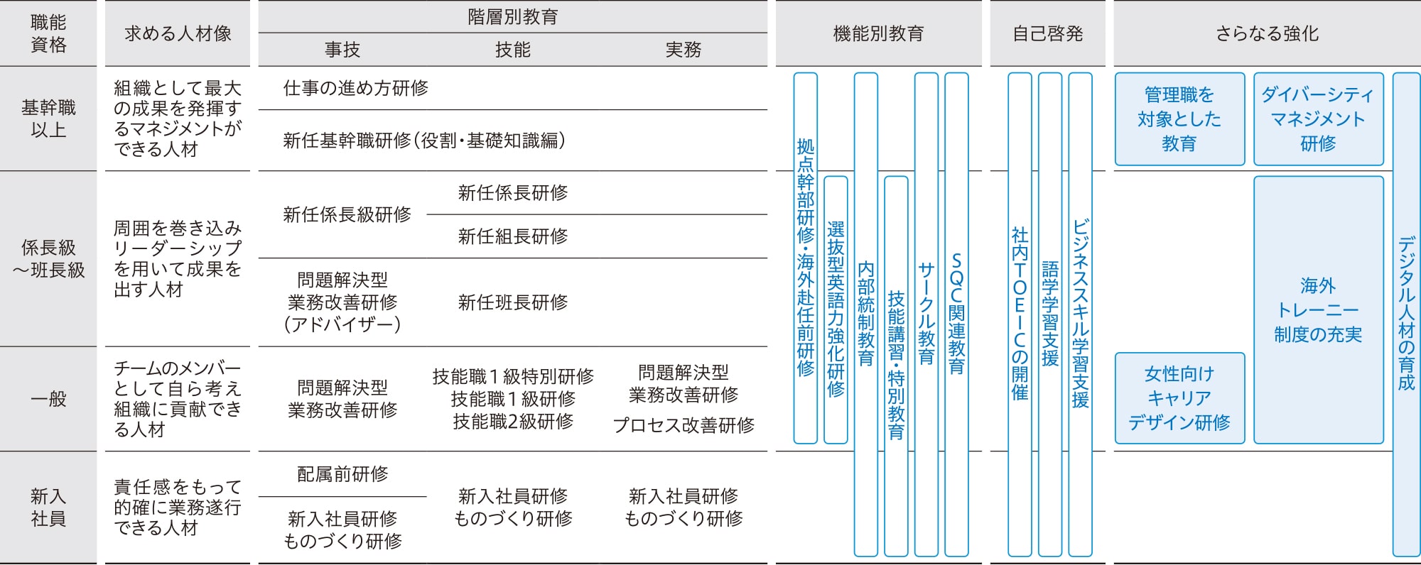 当社では、人材育成方針を「人材マネジメント戦略を実現する教育の機会、仕組みを提供し続ける」とし、人材育成のサイクル(目標設定・役割付与 → 能力・成果発揮 → 評価・フィードバック)を継続して回し、その支援としてOJT、OFF-JT(各種研修)、育成ローテーション(職場異動)を実施しています。階層ごとに求める人材像を定義し、その能力を習得するための教育施策を毎年強化しています。2024年度は様々な施策の充実をはかる中でもキャリア実現の仕組みに特に力を入れ、上司が社員のキャリアについての自己申告に基づきキャリアパスを策定し計画的なOJTの基盤を整備しました。また、若年層から「キャリアデザイン研修」を実施し自身の目指す姿を整理する機会を提供しました。